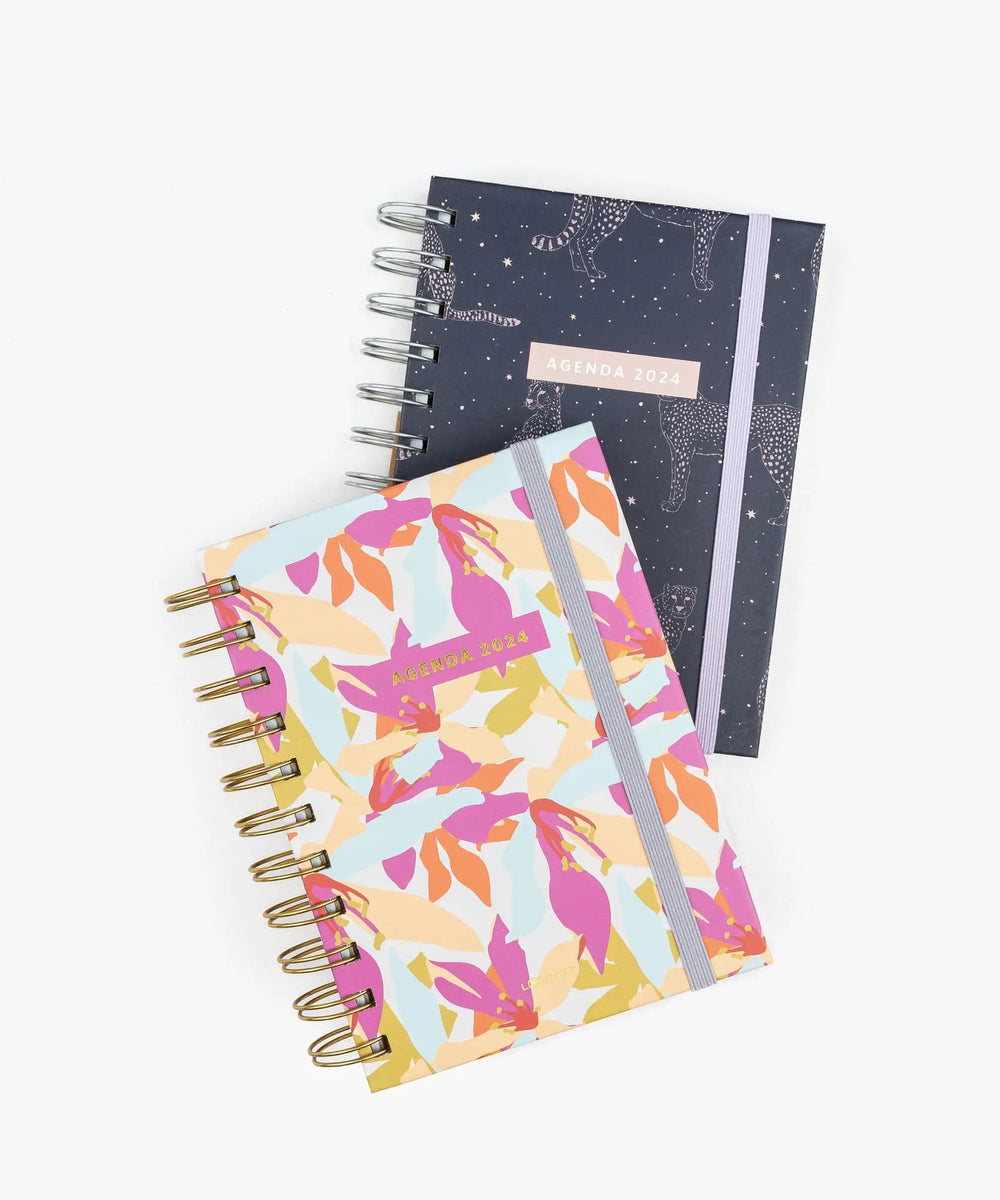 - Agenda pequeña: un modelo que es ideal para llevar dentro de la cartera es esta agenda disponible en dos diseños: negra con un guepardo dorado y otra opción con un fondo celeste, decorada con flores anaranjadas y fucsias. Sus medidas son 15 cm. de alto por 11 cm. de ancho.